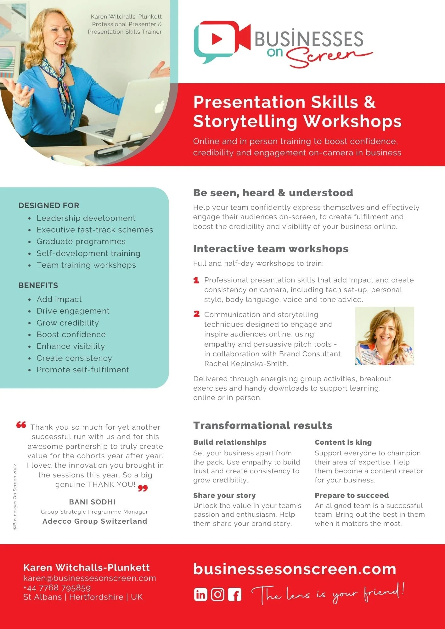 Give your team the support they need to perform at their best. My team workshops and lunchtime tutorials aim to inspire every member of the team to become more confident and visible on screen, knowing they’re representing your business and brand consistently.